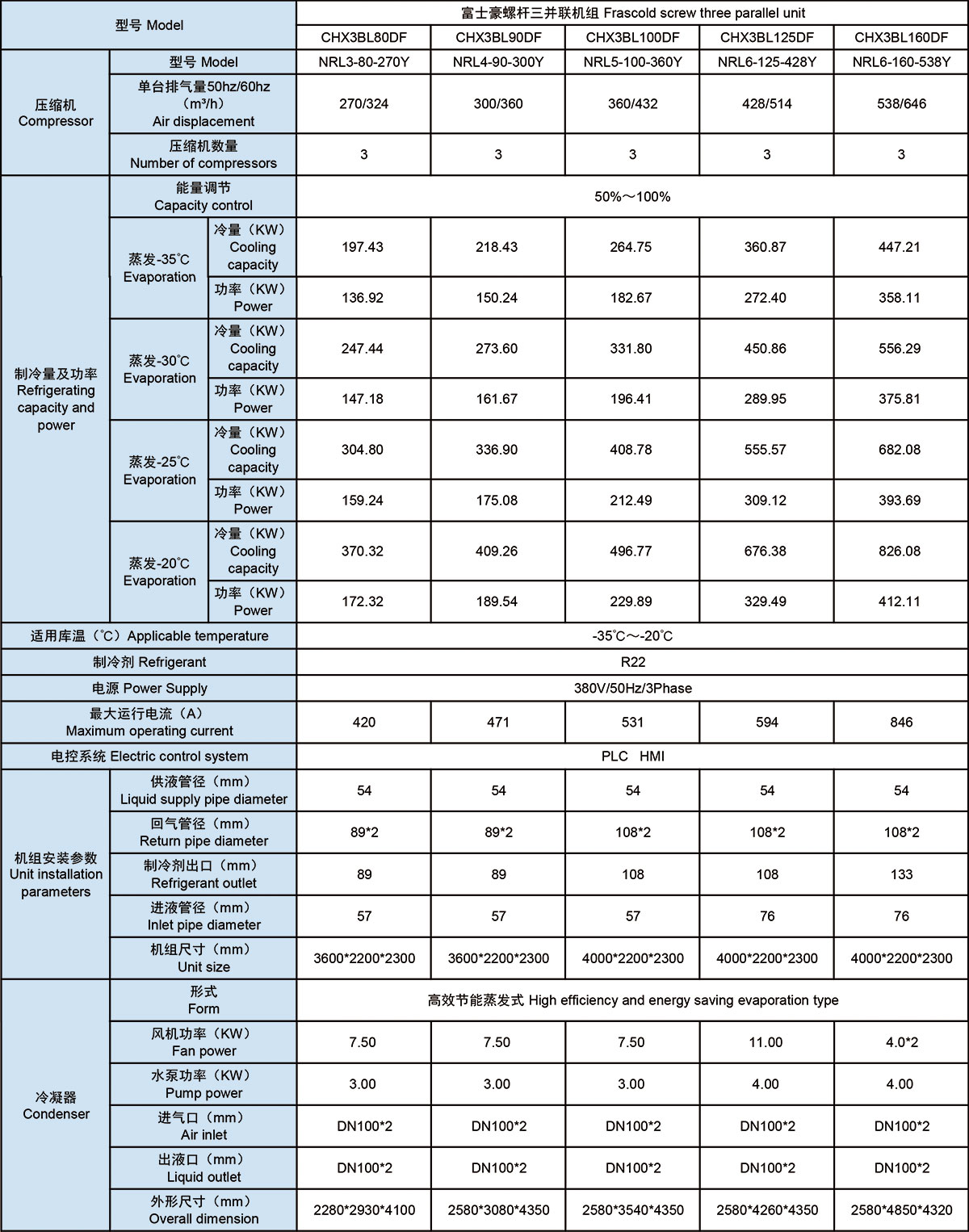 富士豪压缩机制冷机组参数 Frascold compressor refrigeration unit parameters